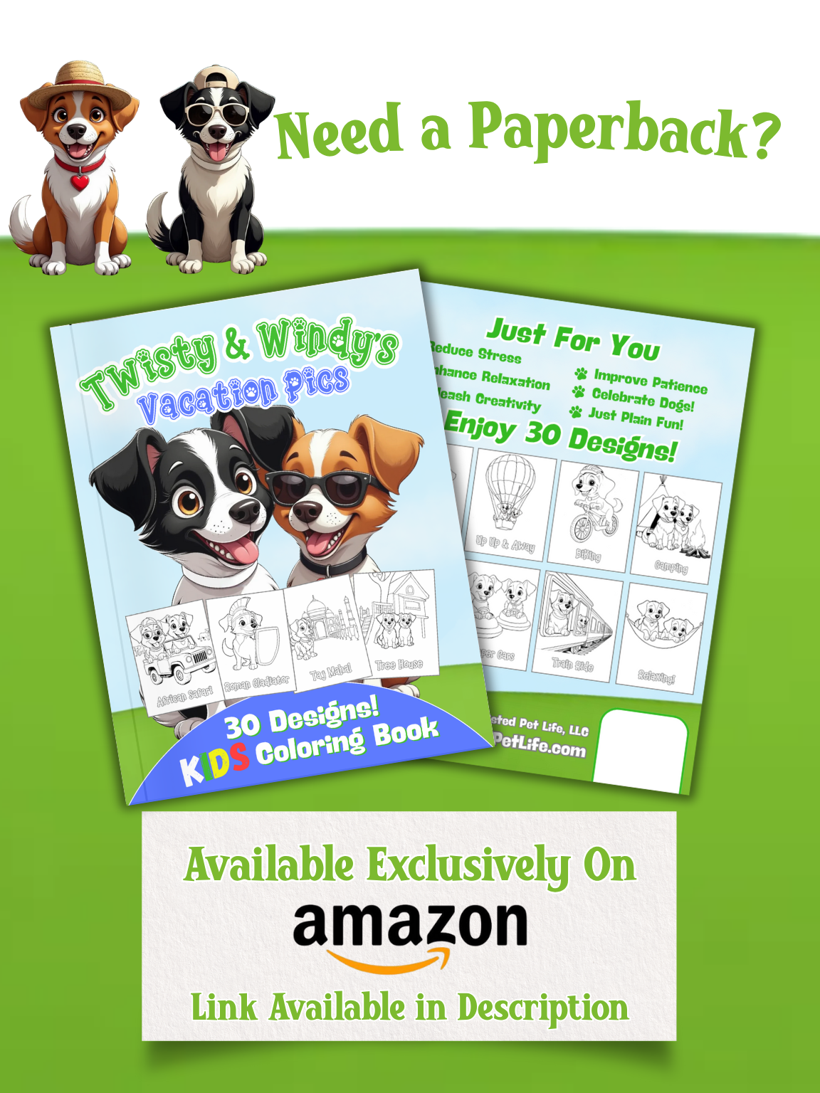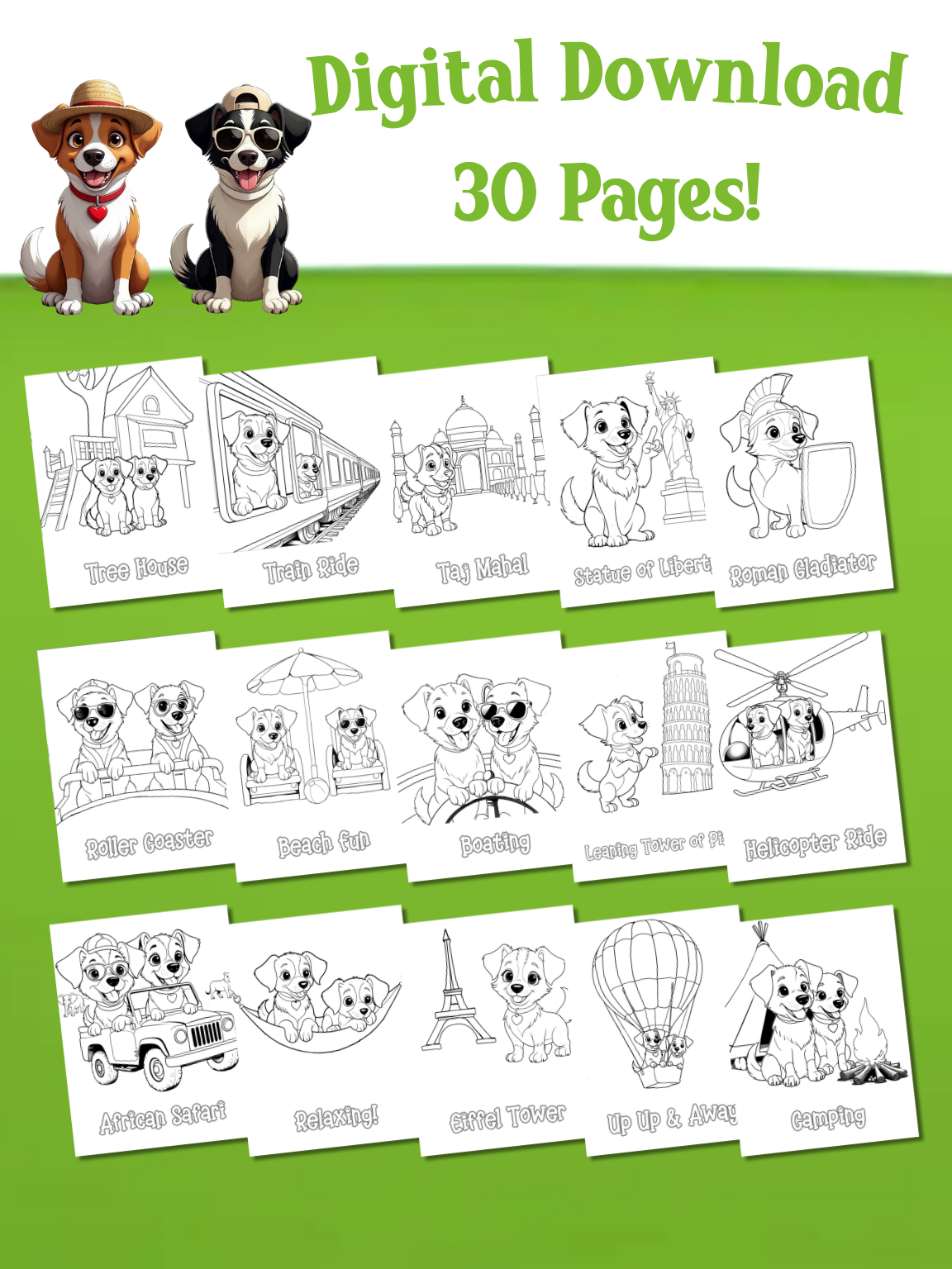 Get ready for an awesome coloring journey for kids! Twisty and Windy, two fun-loving pups, are on an exciting vacation, visiting famous landmarks, camping under the stars, and soaring in hot air balloons. Now, it’s your turn to bring their adventures to life with color!